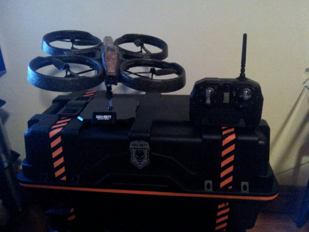 I got the care package too! I have been waiting for this for MONTHS! I really thought it was going to be awesome… It is pretty cool, however, it does seem a little on the cheap side. I paid an extra $100 just for the drone. I figured that it would at least be decent quality. I fly R/C heli’s all the time which is really what drew me to this package. I have 2 batt-op heli’s that are both fairly easy to fly once you get the trim correct and they will fly in ANY direction including 360 degree horizontal rotation. The MQ-27 drone only has 6 way directional flight, including up, down, forward, backward, left and right. Unfortunately it has no horizontal rotation. It also suffers from pretty unstable flight due to its own turbulence. I have been able to achieve long-term flight after playing with the quad trim controls for a while. All-in-all it is a pretty cool package. I do wish that they had provided a little higher quality product that would do more than just hover… A little maneuverability would have gone a long way! Was it worth the extra $100 for a model to set on the shelf and collect dust? Probably not, I was expecting a LOT more from Treyarch! BIG LET DOWN!
